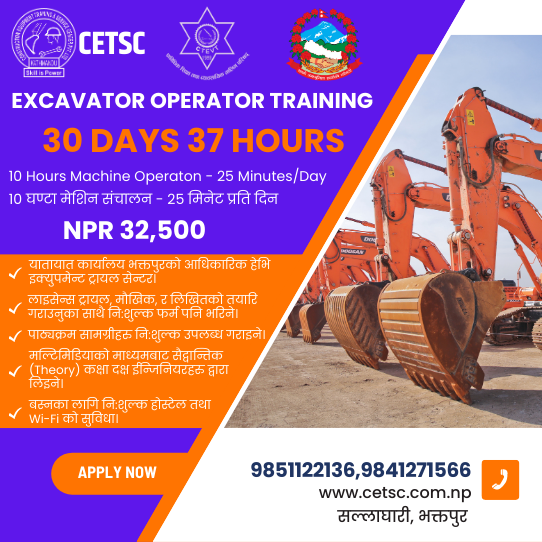 Based in Sallaghari, Bhaktapur Construction Equipment Training and Service Center Pvt. Ltd. (CETSC) is an Operator Training Center founded in 2067 B.S. by a group of engineers, with the objective of establishing itself as a model institution to produce skilled manpower required in the construction sector nationally and globally while improving living standard of lowly educated people. CETSC is affiliated with CTEVT and licensed by the DoTM Govt. of Nepal.