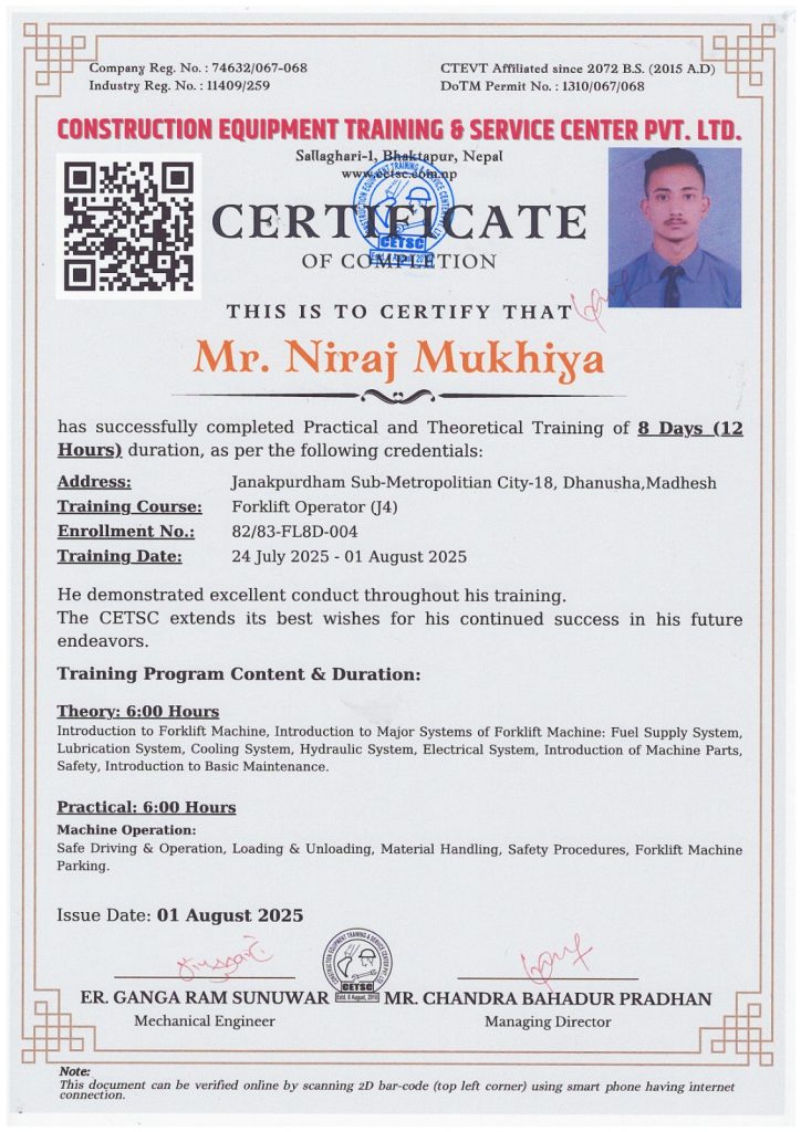 Full Name: Mr. Niraj Mukhiya Father's Name: Mr. Ram Prasad Mukhiya Date of Birth: 1999 June 20 Enrollment No.: 82/83-FL8D-004 Address: Khathekhola Rural Municipality-03, Baglung, Gandaki Training Course: Forklift Operator (J4) Training Duration: 8 Days (12 Hours) Training Date: 24 July 2025 - 01 August 2025 Forklift (J4) Licensed (Yes/No): - License No.: -