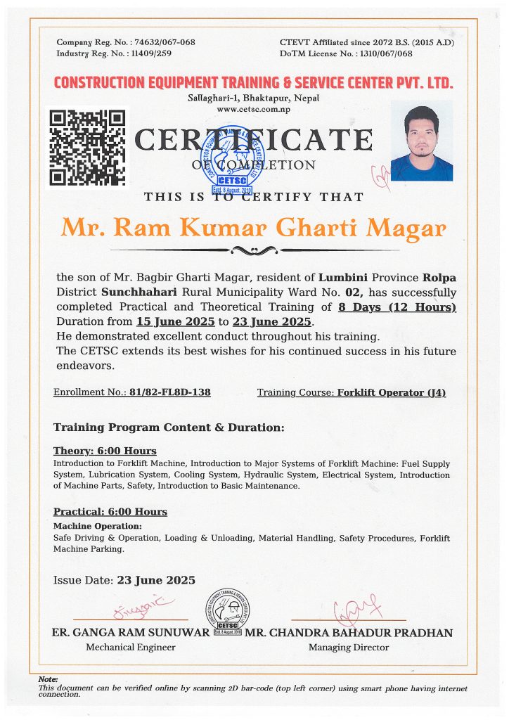 Full Name: Ram Kumar Gharti Magar Father's Name: Bagbir Gharti Magar Date of Birth: 1989 October 02 Enrollment No.: 81/82-FL8D-138 Address:Lumbini, Rolpa, Sunchhahari-02, Nepal Training Course: Forklift Operator (J4) Training Duration: 8 Days (12 Hours) Training Date: 15 June 2025 - 23 June 2025 Forklift (J4) Licensed (Yes/No): - License No.: